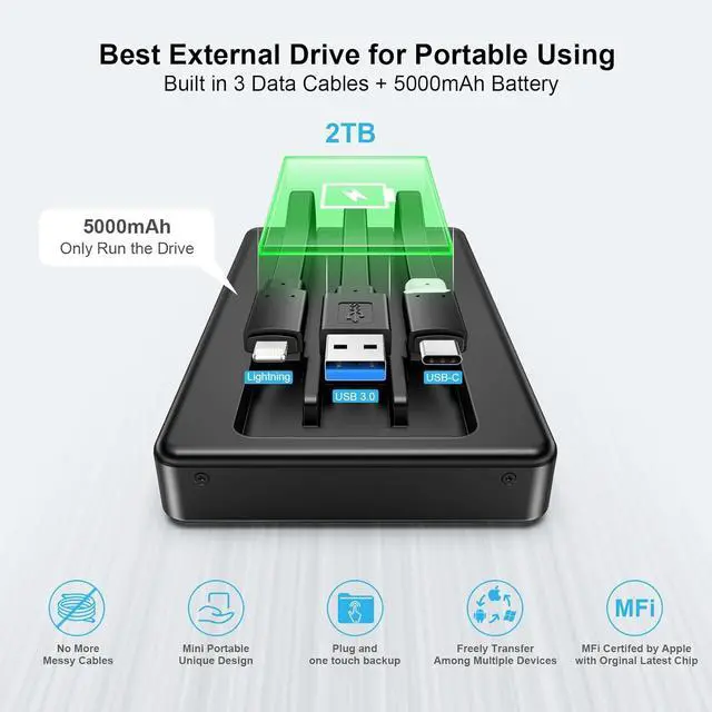 Built-in 3 Data Cables & 5000mAh battery for Portable Using- No need more messy cables or extra power supply which more convenient to use any time anywhere. The plug and play feature makes this phone hard drive as easy as using a usb flash drive; No matter you're using it on your iphone or computer outside, you just need to simply browse and select the files you want to backup, and copy to the hard drive, then the files you chose are successfully backed up and saved.