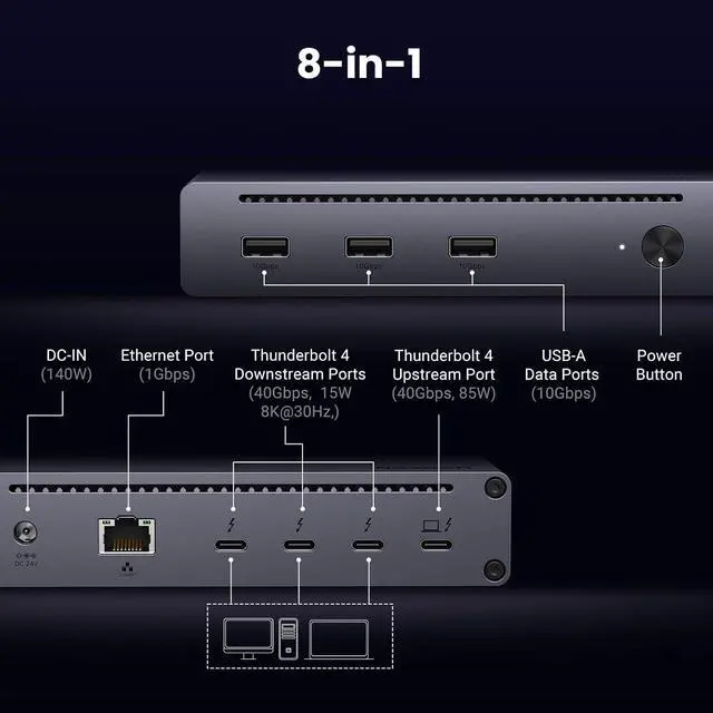 Widely Compatible: The Thunderbolt 4 Hub is compatible with most Thunderbolt 4, Thunderbolt 3, USB4, or USB-C computers or tablets, including Macbooks(macOS 11.4 & above), Windows laptops(Windows 10 & above), mac mini, or other tablets with USB-C ports. (Full-function USB-C laptops and tablets only support single display. Not compatible with Mac mini 2018(). )
