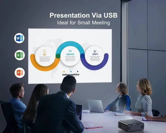 [4P/6D & 100%-50% Zoom & Low Noise for Versatile Projection Needs] In addition to auto screen adjustment, P62 offers features like manual correction, 50%-100% zoom, aspect ratios of 4:3 and 16:9, a sleep timer, and customizable brightness and contrast settings for personalized viewing. For productivity business, it supports Excel/Word/PPT playback via USB. It supports ceiling, tabletop, tripod, and wall mounting with 4*M5 screw holes at the bottom. Simply adding a TV stick (not included) transforms it into a smart projector, allowing you to enjoy streaming apps on a bigger screen.