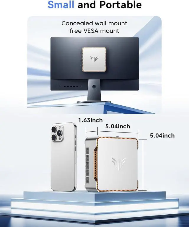 SMALL BUT POWERFUL PC--MINI PC Silver Series has a great texture. The mini computer measures only 5.1 in * 5.1 in * 1.96 in, you can be easily placed in crowded workstations or small spaces. Because of the small size to put under you big screen TV for internet movies instead of just limited by the smart TV paid options. You can also mount a MINI PC behind a computer monitor using VESA, and turn your monitor into a pseudo "All-in-One" which is cool.