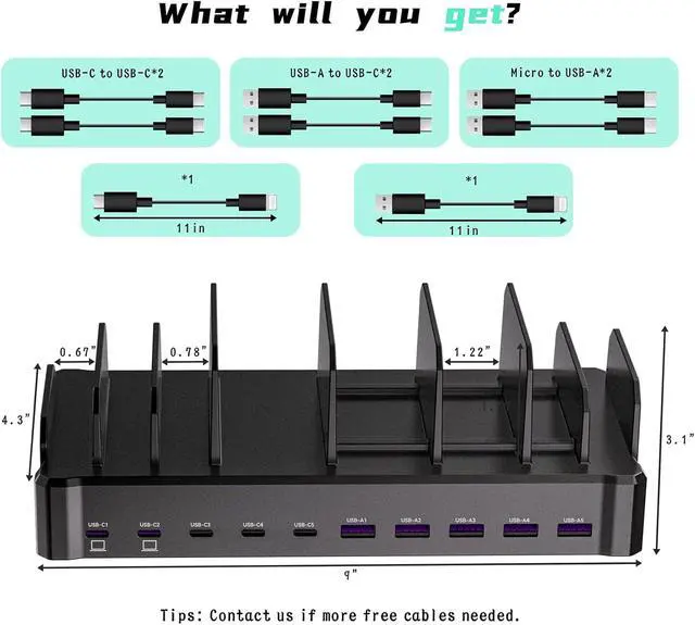 Short Mixed Charging Cables: 2 for iPhone & iPad, 2 Type C, 2 USB C, and 2 Micro USB. Our USB C GaN charger station offers advanced protection features, including Flame Retardant, Over-Current, Over-Voltage, Overcharge, Overload, Overheat, and Short Circuit Protection, ensuring 100% safety for you and your devices. Plus, enjoy peace of mind with our friendly customer service.
