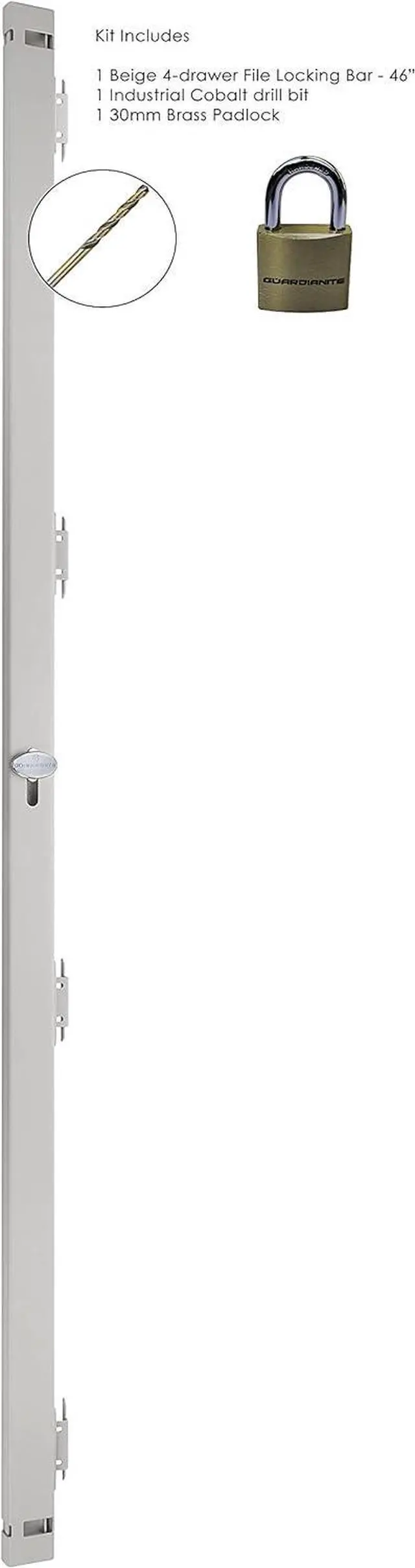 Kit includes: One (1) Guardianite 46-inch File Locking Bar Beige color; One (1) 30-millimeter Keyed Padlock; One (1) Cobalt Drill Bit. Full 1-Year Manufacturer Warranty.