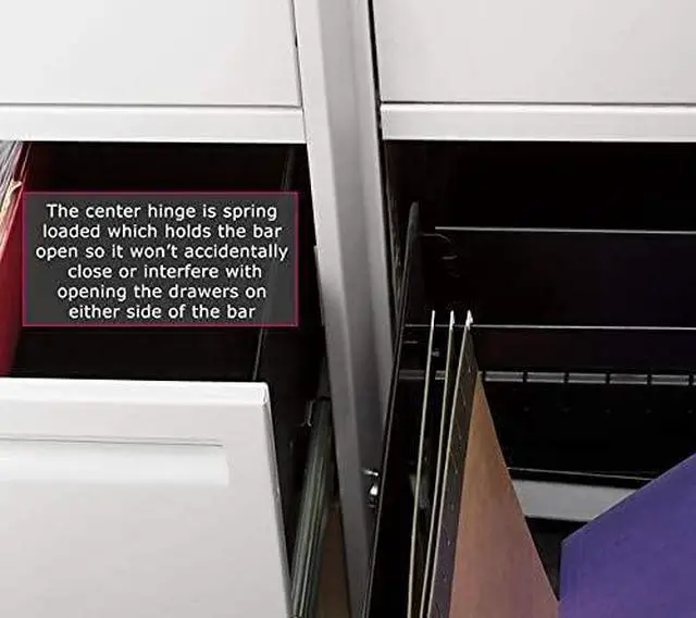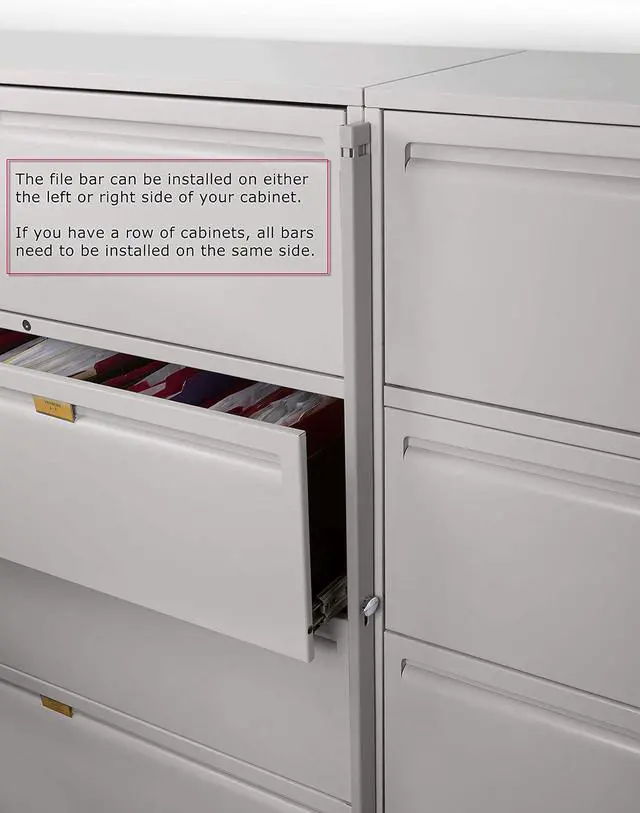 How To Install: It is easy to install on any standard filing cabinet. The 4/5 Drawer File Locking Bar mounts to the 1/2-inch frame on the left or right side of the drawers. One (1) cobalt drill bit and keyed padlock are included. How To Use Our File Locking Bar: Using the file bar is simple. The hinge is spring loaded. Once unlocked, the bar swings open and stays out of the way, making accessing files easy. Our file locking bars will not interfere with opening or closing of the drawers. It also does not obstruct the function of any adjoining file cabinets. To secure the file cabinet, simply close the cover on the file locking bar, lower the handle, and insert the padlock at the top.