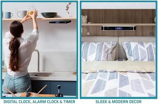 Tune in to your favorite FM radio stations and enjoy a variety of music genres or stay updated with the latest news and talk shows. Bring convenient functionality to your kitchen bright, energy-efficient LED light and an easy-to-read LCD display featuring a digital clock and kitchen timer. Designed with a sleek and modern aesthetic, this wireless LED kitchen light seamlessly integrates into your home decor. Its clean lines and minimalist design make it a stylish addition to any kitchen, complementing both traditional and contemporary interiors. The LCD display offers easy-to-read information, providing convenience at a glance.