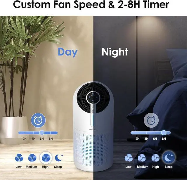TIMER SETTINGS & FILTER REMINDER: Adjust the required fan speed mode (Low/Medium/High/Sleep) to capture as much air pollutants as required according to the size of rooms and and air quality. 4 timer options (2H/4H/6H/8H) allow you set the operating time. When the air filter has been used for over 2160 hours, this RESET light will flash indicating you need to replace a new filter. (Search for more filters: B0C5X8PYDR)