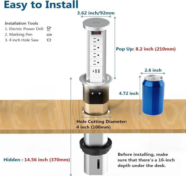 Easy to Install - The pop up plugs for countertops can be installed vertical or horizontal, Cut a 4 inch (100mm) hole, remove the ring and slide the countertop pop up outlet body from top, tighten up the ring from bottom