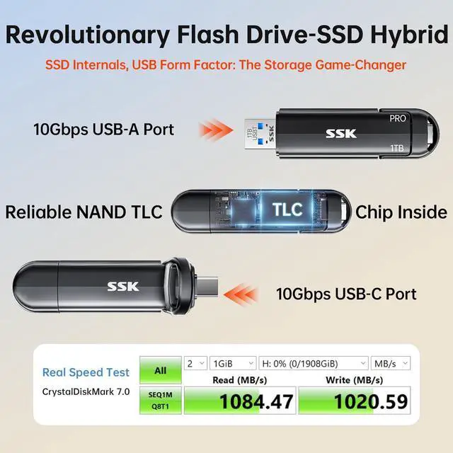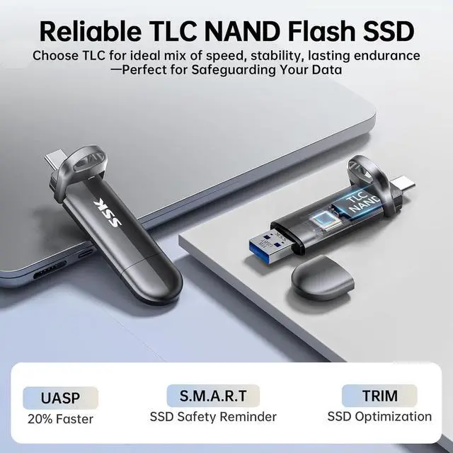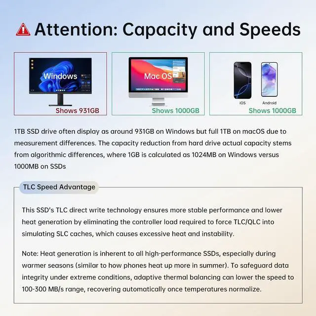 Less Heat: Zinc alloy case of this portable SSD brings superior heat dissipation and premium touch. Additionally, Direct-to-TLC Write technology significantly reduces chip workload, minimizing heat generation from the USB SSD. Under normal conditions, temperatures peak at 132.8 °F