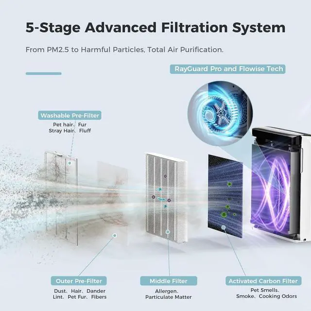 Comprehensive Defense: This air purifiers, equipped with activated carbon, and a pre-filter, effectively removing particles and odors. The Filter captures pet dander and pollen, while activated carbon neutralizes odors, smoke. The washable filter included blocks pet hair, extending its lifespan for all-around purification