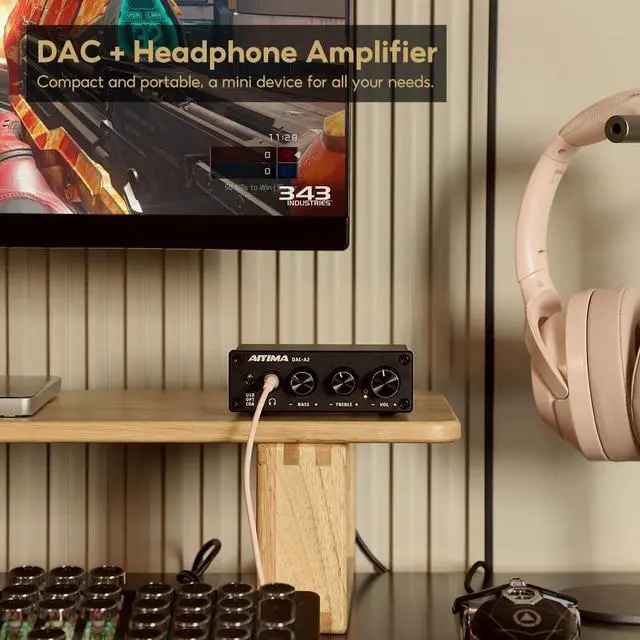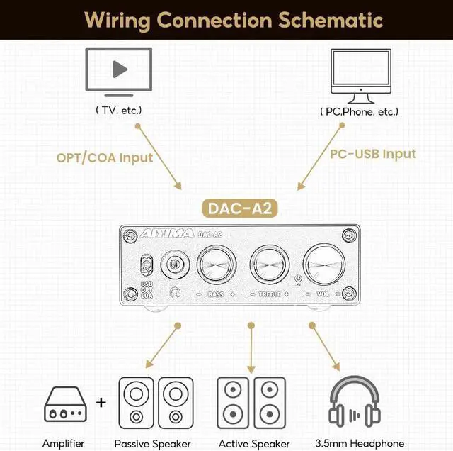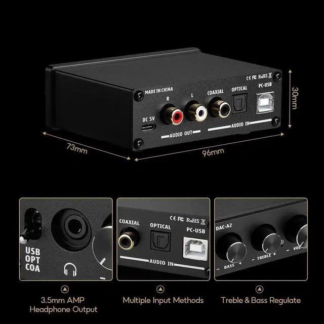 DAC-A2 Headphone Amplifier DAC with Bass Treble Controls PC-USB/Optical/Coaxial Inputs, RCA/3.5mm Headphone Ouput Digital to Analog Desktop Audio Converter DC 5V 24Bit 192kHz