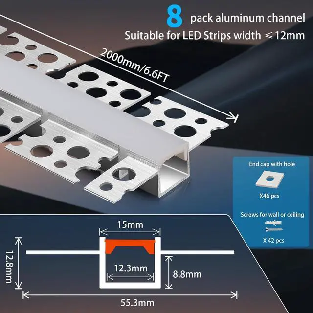 Package Includes: Each kit includes 8 aluminum channels, diffused covers, end caps, and screws. Each segment is 2 meters ( 6.6 feet), with a total length of 16 meters