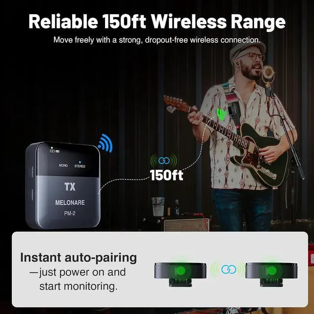 One-to-Many 150FT Wireless Monitoring: A single beltpack transmitter can connect to multiple receivers, each with independent volume control. The IEM system also supports up to 10 complete sets operating simultaneously without interference, offering a stable wireless range of up to 150 ft. Fast auto pairing enables instant connection on power-up, perfect for live events, stage crews, and rehearsals