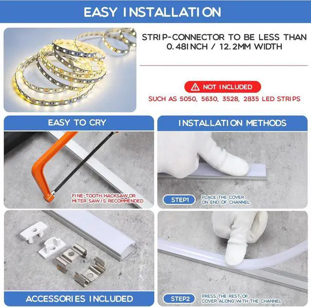 Easy to Install: the LED covers can be simply pressed into channels and they can be cut into specific lengths you required effortlessly by utility knives and scissors; Simply stick the LED strip light's adhesive backing inside the aluminum channel, snap the diffuser cover