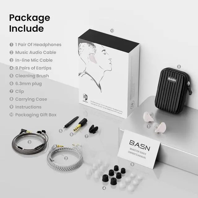 What You Will Get: Basn ear monitors headphones for singers come with a complete kit. A pair of earbuds, 9 pair of ear tips, a OFC silver-plated cable, a inline mic cable, a 6.3 mm plug, a T-shirt clip, a instruction, a hard case, a cleaning brush.