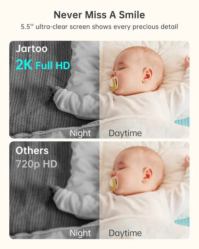 [Long-Range & No WiFi Needed] Stay connected to your baby anywhere at homefrom the kitchen to the backyardwithout relying on your internet. The Jartoo monitor operates on a private, secure connection, so it cant be hacked and wont drop when your WiFi does. Enjoy a stable, crystal-clear feed even in areas with weak signals, giving you true peace of mind.