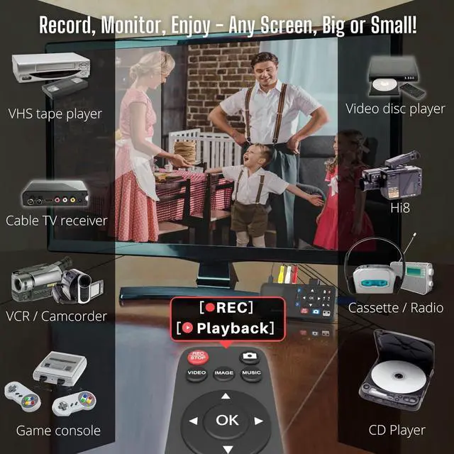 Is my device compatible with it? - ClonerAlliance ViewLite AV is compatible with a wide range of devices with analog signal inputs, including VHS, HI8 players, camcorders, set-top boxes, DVD/VCD players, retro gaming consoles, portable cassette players, radios, and more. Convert any source with Composite/S-Video/RCA/TRS outputs seamlessly.