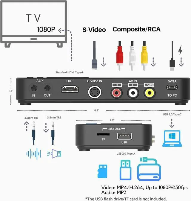 Portable, analog-to-digital converter, MP3 audio recorder, advanced digitization chip, and 1080p upscaler. Standalone Analog to Digital Converter