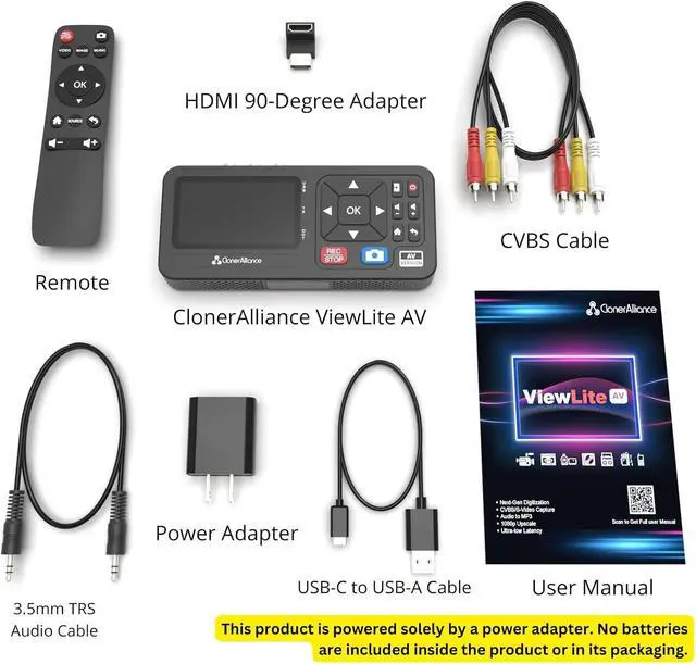 What's more? - ClonerAlliance ViewLite AV goes beyond core features with free ClonerAlliance AI Video Enhancer and Helper software, an HDMI 90-degree adapter. Enjoy a 90-Day No Hassle Return (at our cost) and a 2-Year replacement service for peace of mind. [This product is powered solely by a power adapter. No batteries are included inside the product or in its packaging. ]