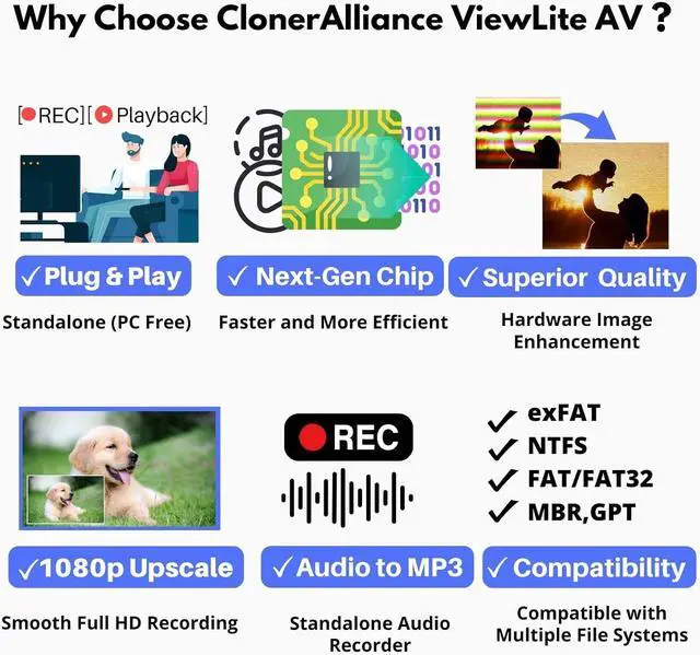 Why choose it over other similar products? - Ideal for newbies and older adults, ClonerAlliance ViewLite AV boasts superior picture quality, a LCD screen with 640x480 high resolution, broad compatibility, high-performance recording, flexible storage options, remote control, and PC connectivity. Its sleek design, durability, and ease of use set it apart from competitors.