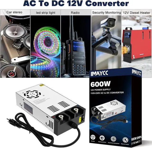 Wide ApplicationThis ac to dc converter Widely used in most 12V device, such as 12V diesel heater, radio, broadcasting, LED display, LED Strip Light, CCTV Camera System, 3D Printer, Car Stereos, PCP Compressor etc.