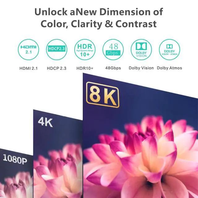 YcbCr 4: 4: 4, backwards compatible with 1080P/720P@60/50Hz..., support HDR10+, Dolby vision, Dolby Atmos, 48Gbps bandwidth