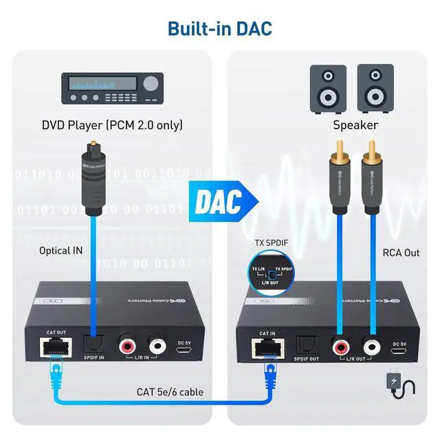 Packed With Features: The audio over Cat5e extender includes a built-in digital-to-analog converter, allowing it to pass digital audio directly to speakers or analog audio equipment