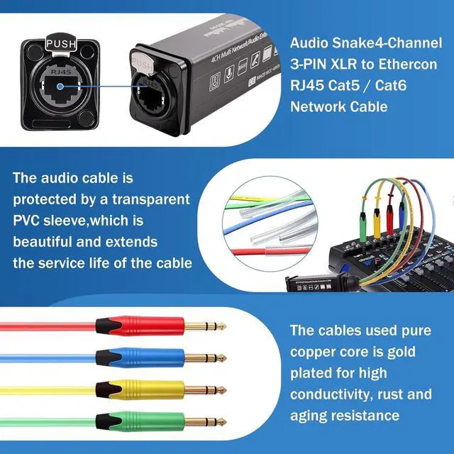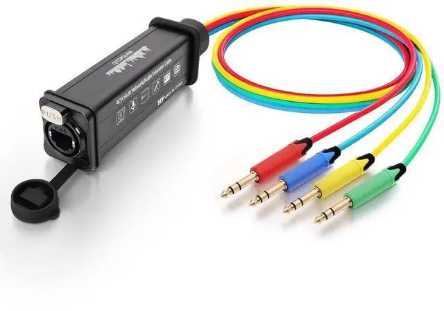 The Cat5/Cat6 Ethernet connector RJ45 interface with a Dust-proof cover, the converter is an insulated flame retardant shell, high temperature and corrosion resistant. The cables used pure copper core is gold plated for high conductivity, rust and aging resistance. Each 6.35 mm TRS connector made gold plated, it reduces noise interference and ensures high-quality audio signal transmission. And extended the service life.