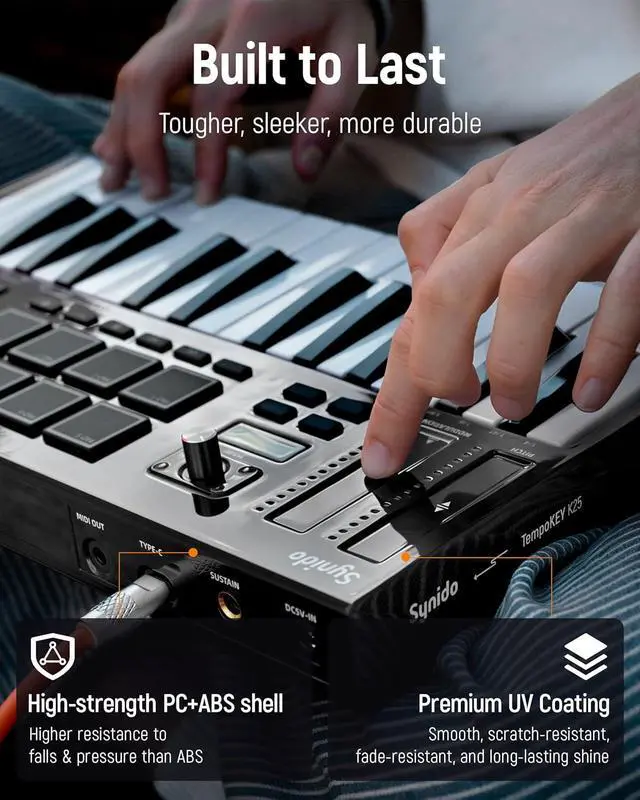 [Versatile Connectivity]: Connect to synths, drum machines, and more with the 1/8 MIDI Out, or use the 1/4 sustain input for expressive playing. USB-C port ensures fast data transfer and stable power supply, while a DC 5V input supports continuous performance. Plug & play with phone, tablet, or PC