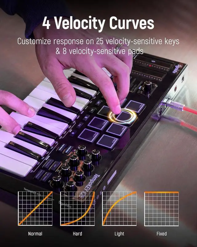 Comfortable to Play Anywhere]: Weighing only 2.11 lbs and just 1.82 inches thick, this compact MIDI keyboard is ideal for capturing ideas on the go. Features responsive spring-loaded keys with a deeper 0.59" key travel for authentic touch, plus non-slip silicone strips on the base for stability during energetic play