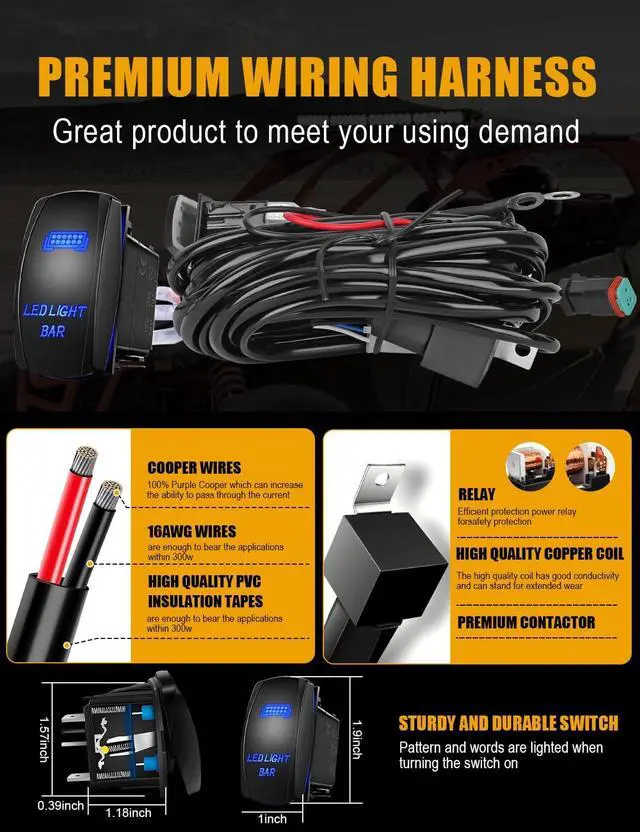 everything needed for installation: 1x 13.4 -inch Single Row Amber LED Light Bar, 1x Heavy-Duty Steel Shock Tower Bracket, and a complete Plug-and-Play Wiring Harness with a relay, fuse, and dedicated "LED Light Bar" rocker switch.
