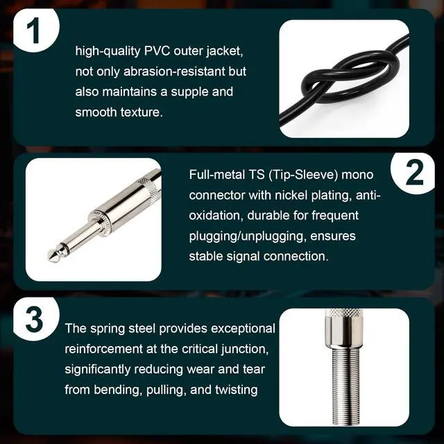 Nickel-Plated TS Connectors]: 1/4-inch TS (Tip-Sleeve) mono connectors with a full-metal body and nickel-plating, these connectors offer increased hardness, excellent corrosion resistance, and are built to endure frequent plugging and unplugging, ensuring a consistently stable physical connection in any environment.