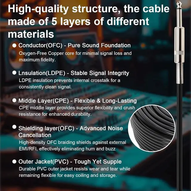 [Universal Compatibility for All Your 1/4" Gear]: The perfect cable for a wide range of professional and personal audio equipment. Instantly connect your electric guitar, bass, keyboard, synthesizer, drum machine, audio interface, or mixer with the standard 1/4" TS connector. It's the versatile audio solution you need.