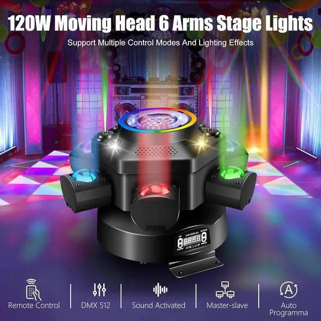 Superior Coverage & High-Intensity OutputEngineered with high-luminance LEDs and optical lenses, our moving lights produce crisp, bright projections that captivate audiences. Luces para dj profesional's 6-arm design ensures wide-angle coverage, casting elaborate patterns and vibrant hues across any venue. With exceptional strobe and dimming capabilities, Luces dj meets the demands of Club and Bar environments while remaining suitable for smaller events like family gatherings and home parties.