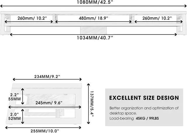 Computer Height: Desk shelf can raise your screen by 5.4 inches. By elevating the monitor to an ergonomically correct viewing height, the monitor riser can effectively alleviate your neck pain.