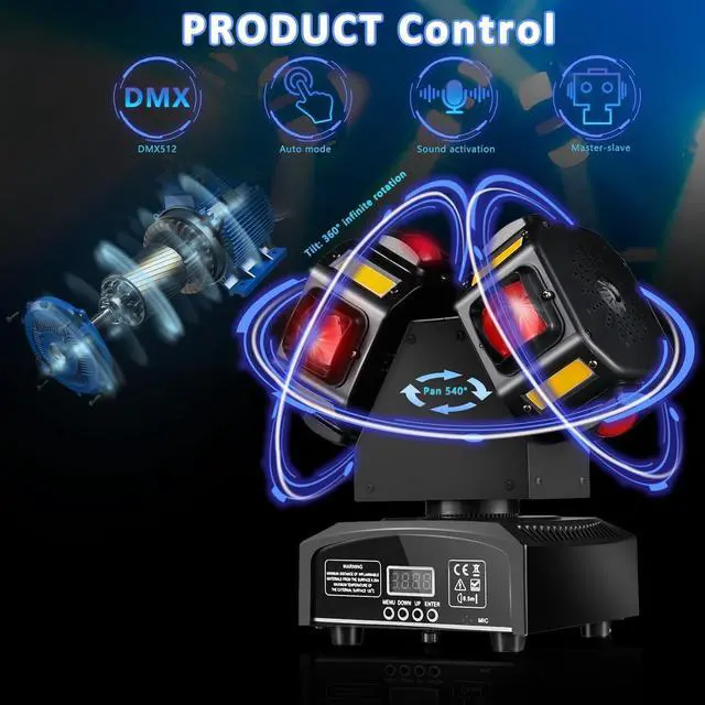 2-SIDED MOBILE ALL-ROUND LIGHTINGThis DJ light has lights on both sides, the moving mode is X-axis positioning and forward and backward rotation, and Y-axis infinite rotation; it is equipped with a variety of light effects, such as RGBW mixed dimming, RGBW water effect, beam light, color selection and color change, with special line beam effect, it is very suitable for clubs, DJ shows, family gatherings, dance halls, KTV, etc.