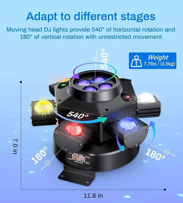 Install]: With a built-in metal handle, this light can be quickly mounted to ceilings, trusses, or wallsno extra tools or hassle required. This moving head stage light offering versatile 540° horizontal and 180° vertical rotation. Its a great fit for both fixed setups and mobile DJs