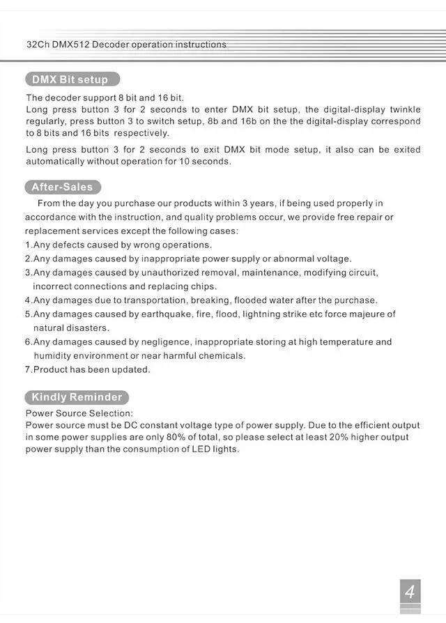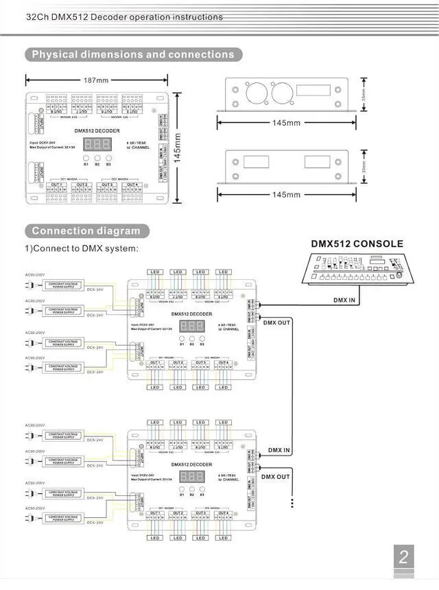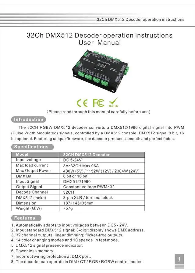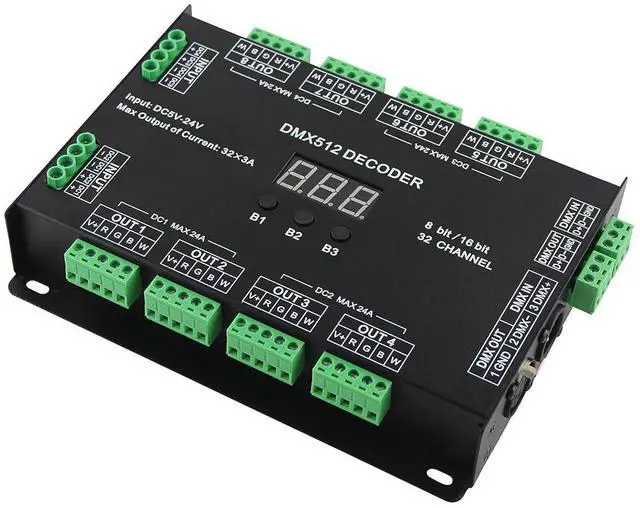 The 32CH RGBW DMX512 decoder converts a DMX512/1990 digital signal into PWM (Pulse Width Modulated) signals, controlled by a DMX512 console, DMX512 signal 8 bit, 16 bit optional. Featuring unique firmware, the decoder produces smooth and perfect fades.