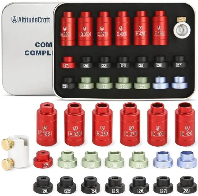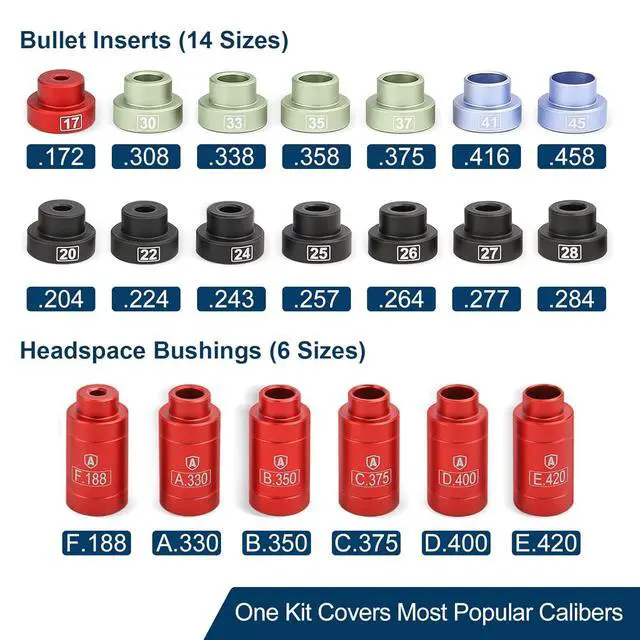 What's Included in the Comparator Reloading Set: The kit includes the comparator body, 14 inserts for bullet diameters 172, 204, 224, 243, 257, 264, 277, 284, 308, 338, 358, 375, 416, and 458, and 6 bushings for sizes A. 330, B. 350, C. 375, D. 400, E. 420, and F. 188, An Allen Wrench and a Setscrew are also included.
