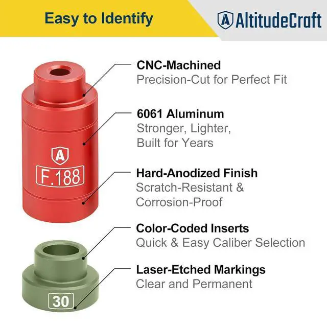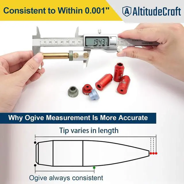 Enhanced Accuracy: The dual-screw design of the bullet comparator body enables seamless connection to your caliper blade, eliminating the need for a third hand to obtain accurate measurements. Inserts are color-coded and feature a ceramic-like hard anodic finish for enhanced durability, simplifying identification and increasing longevity.