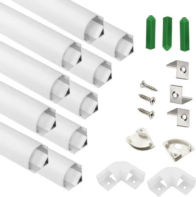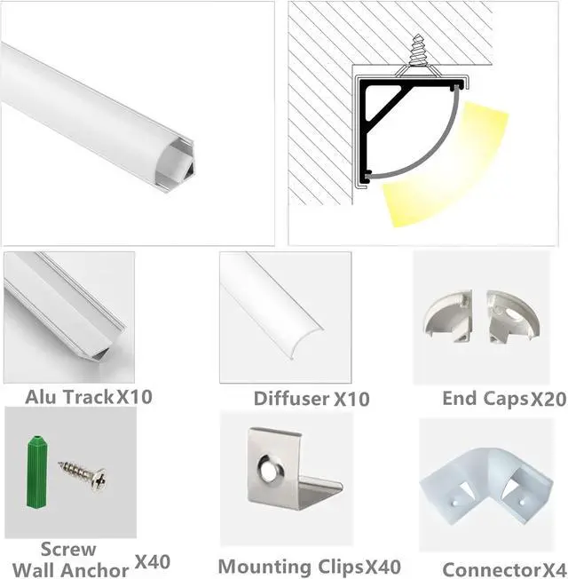 The Package Include V Shape Channel 6.56FTX 10, Milky PC Cover X10, Mounting Clips X40, Stainless Steel Countersunk ScrewX40, End Caps With Hole X20, End Cap Without Hole X2090 Degree Corner ConnectorX4
