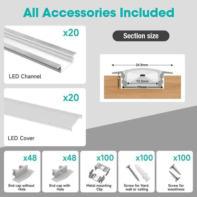 Easy Installation: Our led diffuser channel are designed for easy installation. Each package includes end caps and mounting clips, allowing you to easily cut the LED strip to the desired length for various applications.