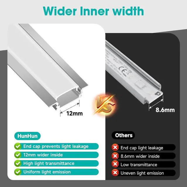LED Strips: Fits most popular LED strip types. 12mm inner width accepts PCB width up to 11mm led strip channel, such as 3528, 5050 & 5630 LED strips (Normally type), Simply stick the aluminum adhesive backing inside the led strip diffuser, snap on the diffuser cover.