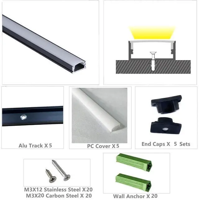 The Package Included Pre-Drilled Channel 3.28FTX 20, Milky PC Cover X20, M3X12 Stainless Countersunk Steel ScrewX80/M3X20 Corbon Steel Screw X80, Wall Anchor X80, End Caps With Hole X20, End Caps Without Hole X20