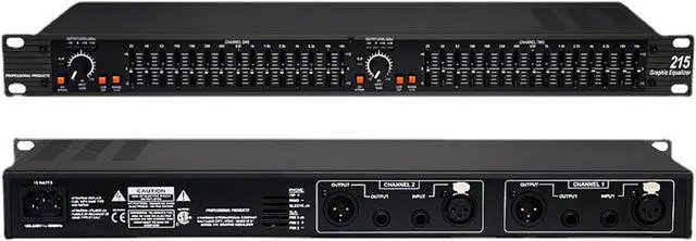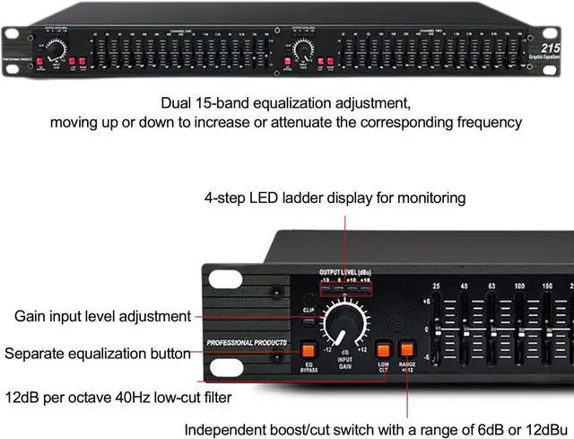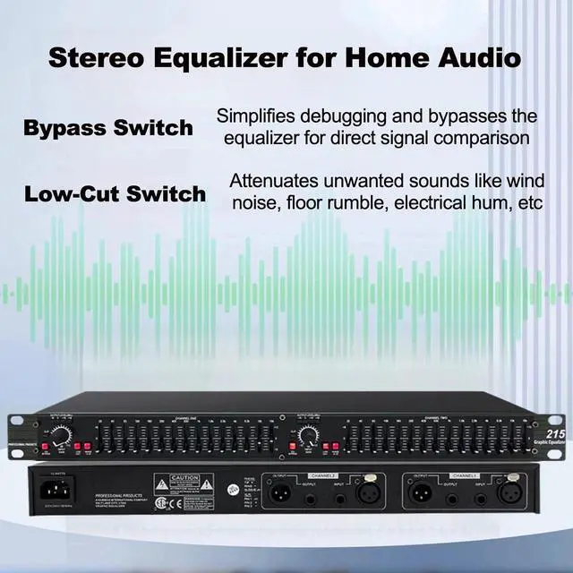Digital Graphic Equalizer, Dual Channel 15-Band Stereo Equalizer for Home Audio, Professional Stereo EQ DJ Equalizer, 1U Rack Mount, By-Pass & Low-Cut Switch, Noise Reduction (EQ-215)