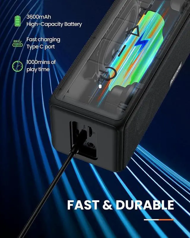 Extended Battery Life: 3600mAh high-capacity battery provides you with more than 1000mins of play time. This speaker uses a more stable charging port - type C port, which greatly saves your waiting time.