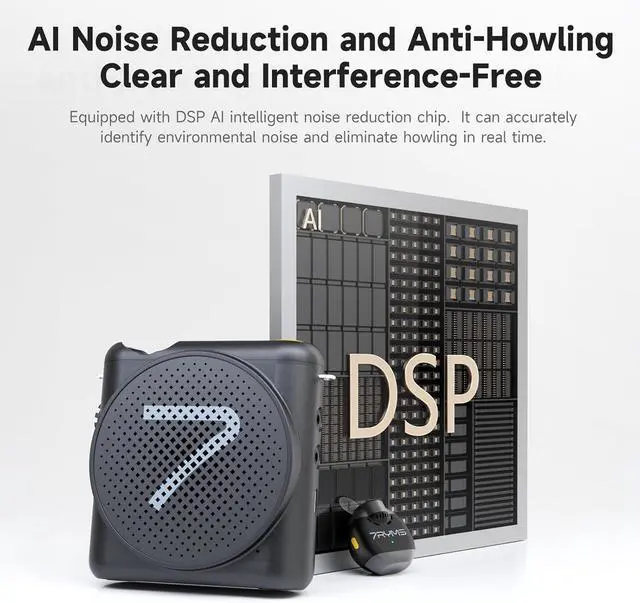 DSP AI Noise Cancellation & Feedback Suppression This portable voice amplifier with microphone features a built-in DSP AI intelligent noise reduction chip that minimizes background noise, wind, and feedback, ensuring clear, stable sound. Perfect as a microphone speaker, portable PA system, or wireless teaching amplifier.