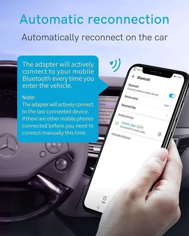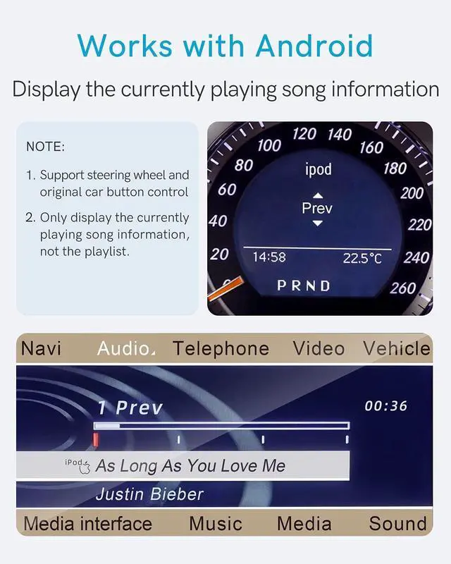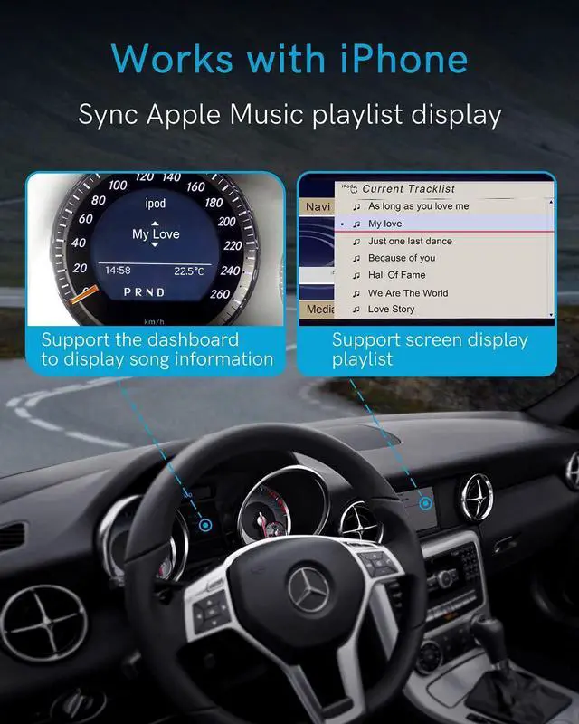 on Car Screen Displays playlists via iPhone apps* and shows artist/title for streaming services. Works with iOS & Android. (*Playlist feature limited to iPhone).