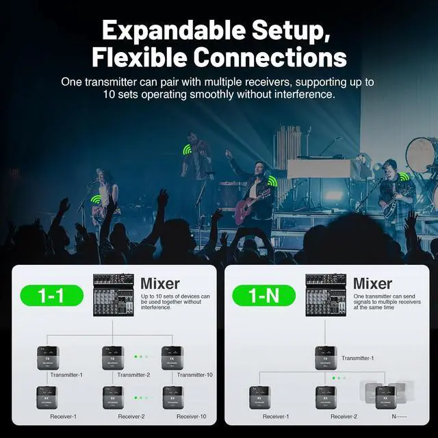 One-to-Many 150FT Wireless Monitoring: A single beltpack transmitter can connect to multiple receivers, each with independent volume control. The IEM system also supports up to 10 complete sets operating simultaneously without interference, offering a stable wireless range of up to 150 ft. Fast auto pairing enables instant connection on power-up, perfect for live events, stage crews, and rehearsals