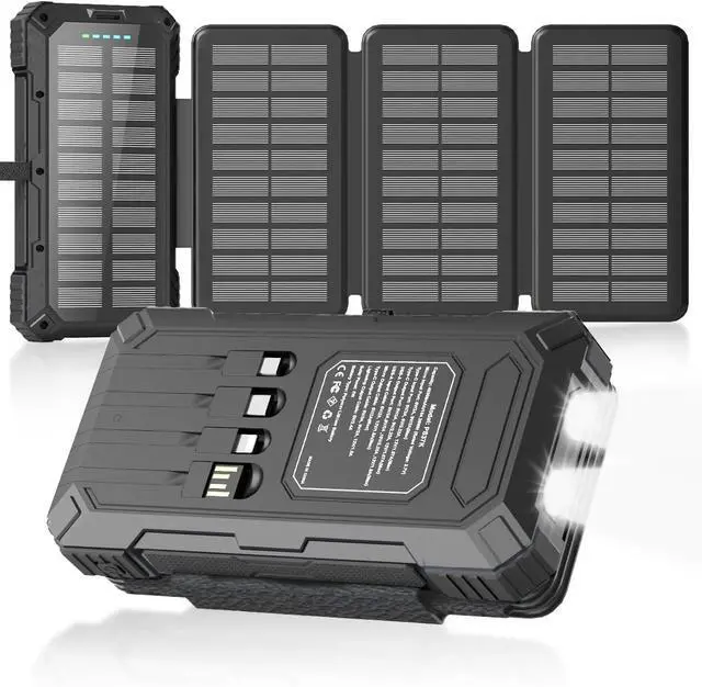 Solar Charger Power Bank 49800mAh with 4 Built-in Cables & 4 Foldable Panels, PD22.5W Fast Portable Phone Charger, External Battery Pack with USB-C in/Output & Flashlight for Outdoor Camping