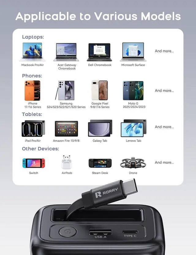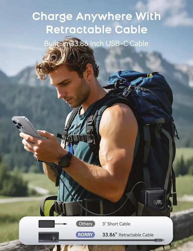 Innovative Retractable Cable Design: Featuring a built-in retractable 33.86 in USB-C cable, this power bank offers a tangle-free charging solution. Simply pull to extend and charge your devices without the need for extra cables, greatly enhancing portability. When not in use, the retractable design keeps your backpack or pocket neat and organized, ensuring hassle-free charging on the go.
