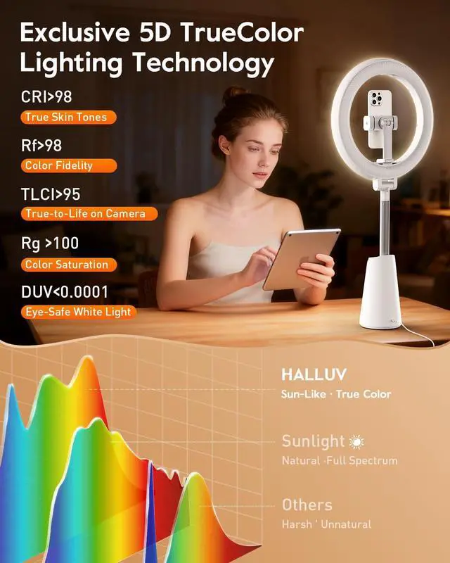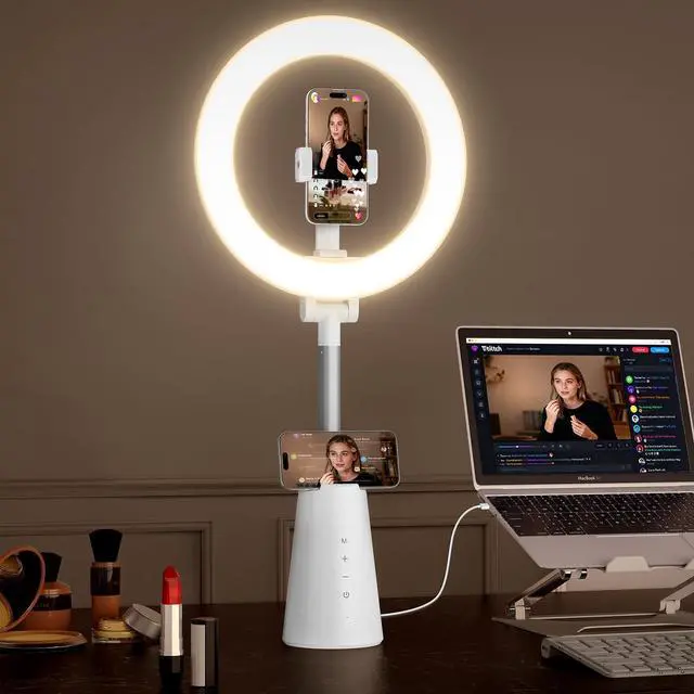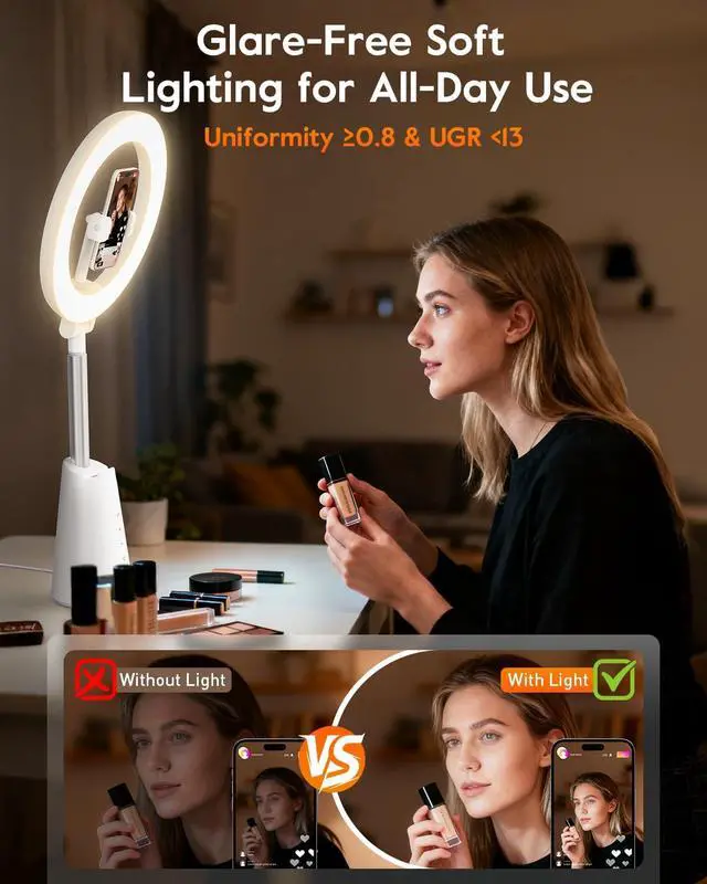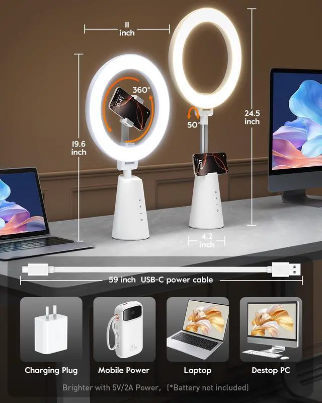 Stable & Plug-and-Play Ring Light with Stand Compact 4.2" conical base delivers rock-solid stability without clutter. Height adjusts from 19.6" to 24.5" for flexible desk setups. Includes a 59" USB-A to USB-C cable for true plug-and-play power from laptops, desktops, or power banks. Features a 360° rotating phone holder ( 2.2" 4.5" ) for vertical or horizontal shootingideal for video conferencing, webcam calls, and online meetings, delivering reliable, professional lighting every time